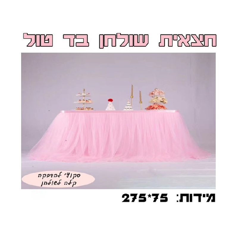 חצאית שולחן עשויה בד טול בצבע ורוד עם סקוץ' להדבקה קלה לשולחן.
