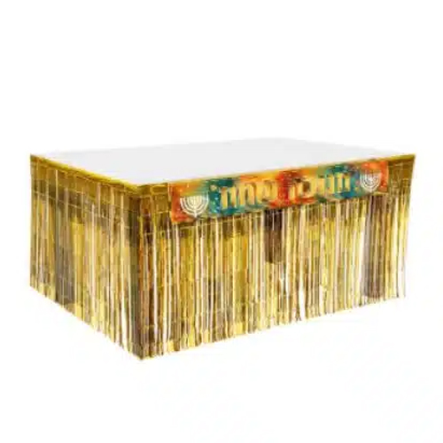 חצאית שולחן חגיגית בצבע זהב נוצץ עם עיצוב עליון וטקסט של חנוכה שמח.