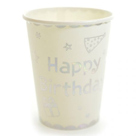 כוסות נייר עם הכיתוב Happy Birthday בצבע כסף לייזר.