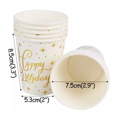 כוסות נייר עם הכיתוב Happy Birthday בצבעים לבן וזהב.