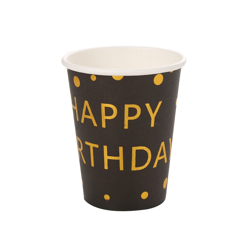כוסות נייר עם הכיתוב Happy Birthday בצבעים שחור וזהב.