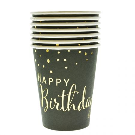 כוסות נייר עם הכיתוב Happy Birthday בצבעים שחור וזהב.