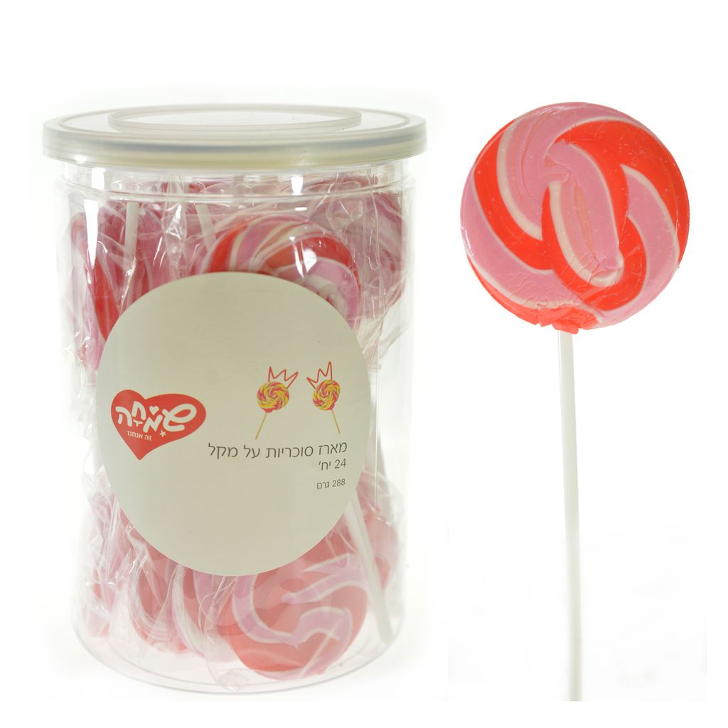 מארז סוכריות על מקל בצנצנת עיגול אדום ורוד ולבן.
