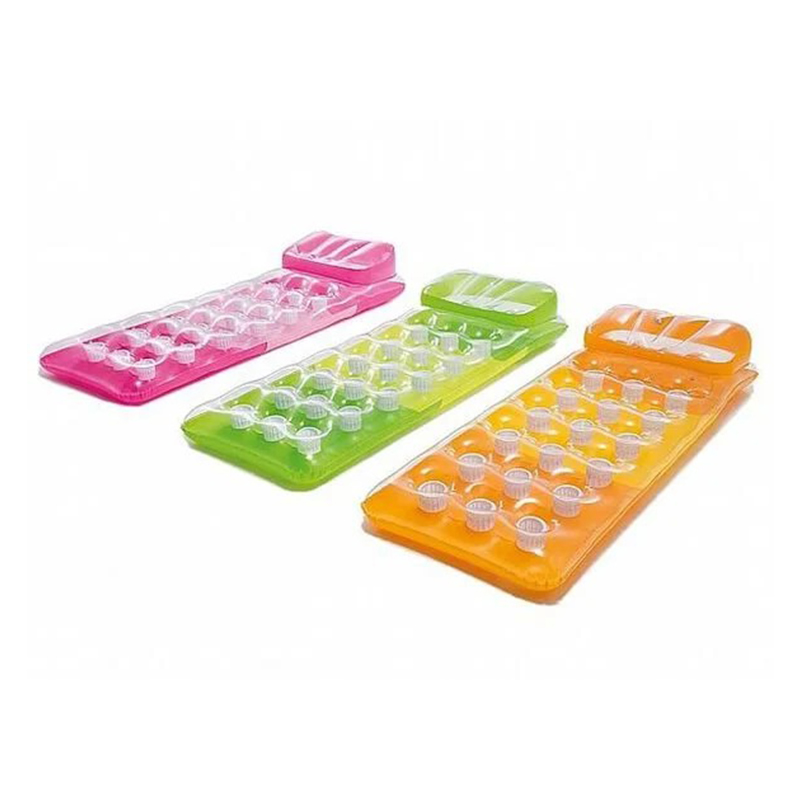 מזרן ים לבריכה דגם כוסות עם כרית במגוון צבעים: ורוד, ירוק וכתום.