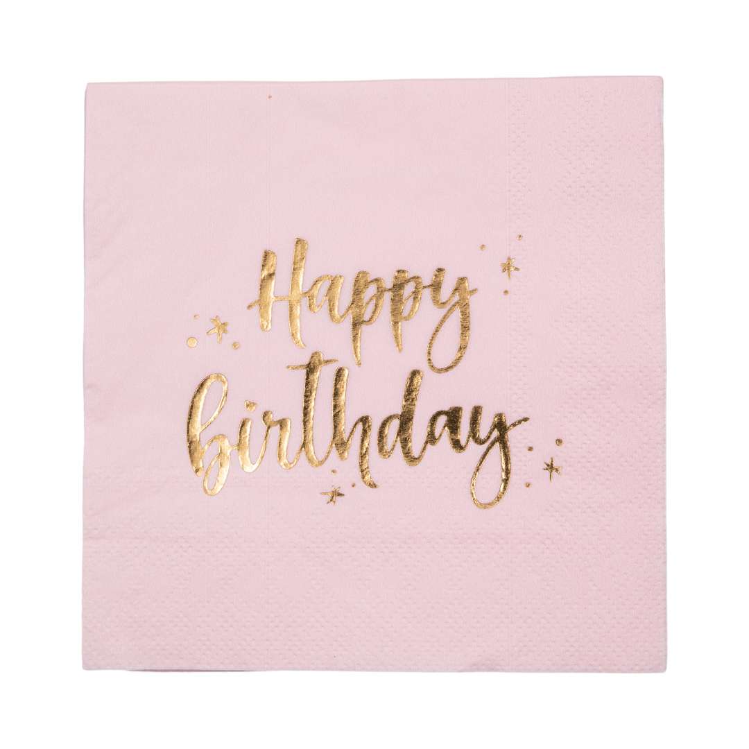 מיני מפיות נייר עם הכיתוב Happy Birthday בצבעים ורוד וזהב.