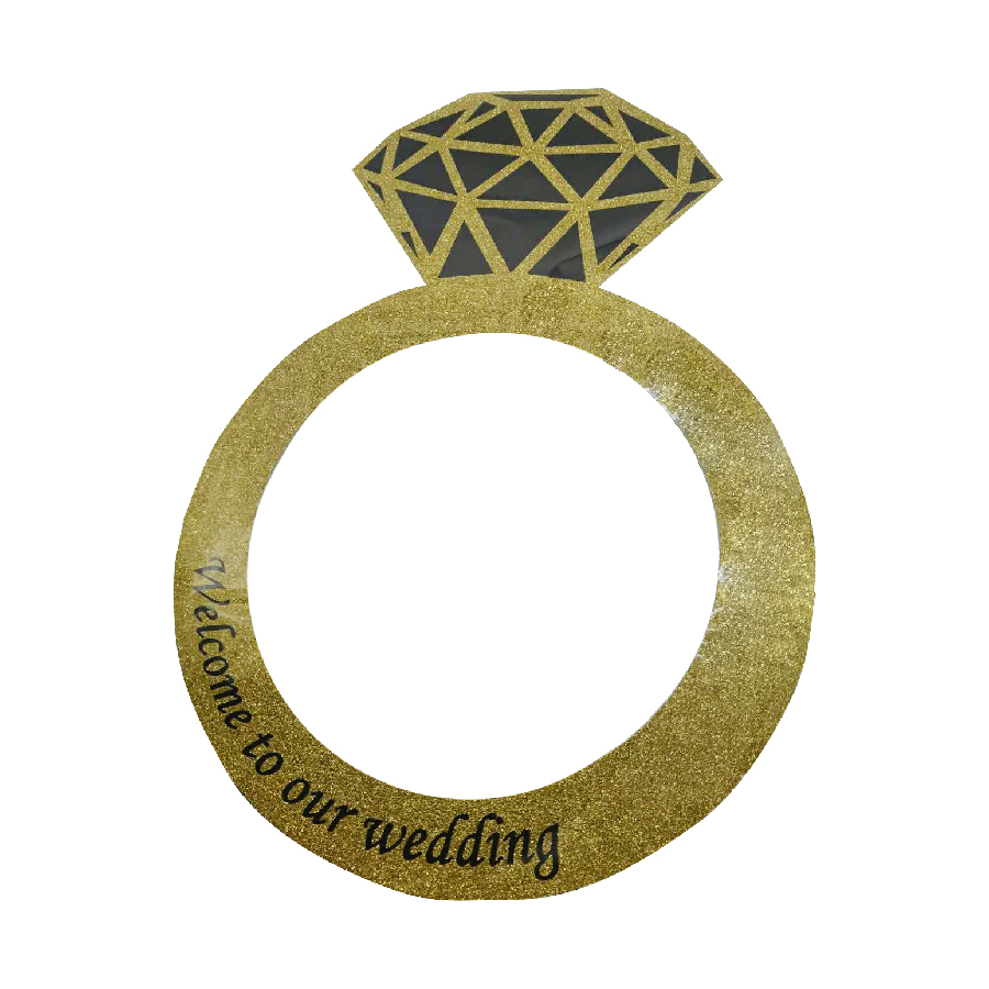מסגרת צילום בצורת טבעת יהלום בצבע זהב עם כיתוב WELCOME TO OUR WEDDING.