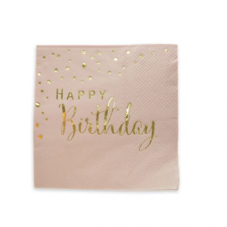 מפיות נייר עם הכיתוב Happy Birthday בצבעים ורוד וזהב.