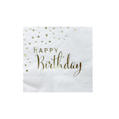 מפיות נייר עם הכיתוב Happy Birthday בצבעים לבן וזהב.