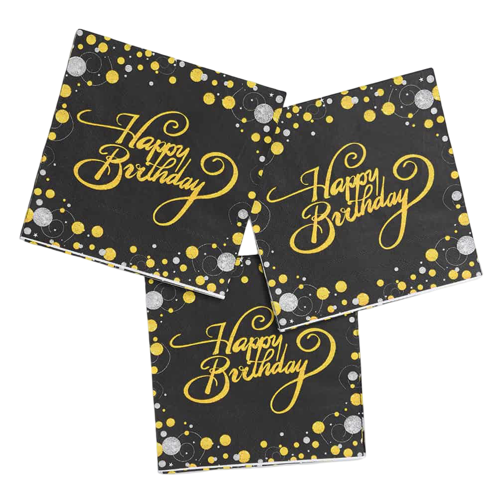 מפיות נייר עם הכיתוב Happy Birthday בצבעים שחור וזהב.
