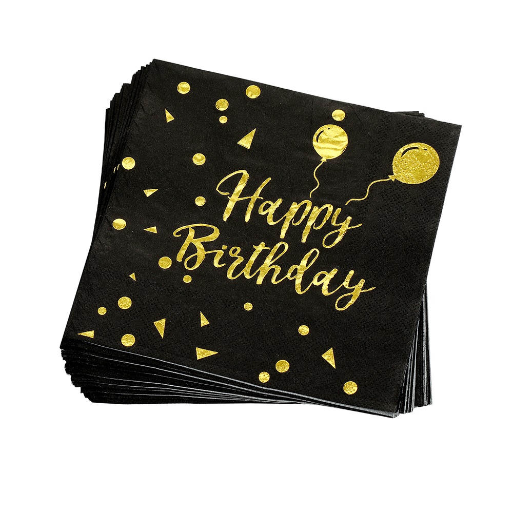 מפיות נייר עם הכיתוב Happy Birthday בצבעים שחור וזהב.