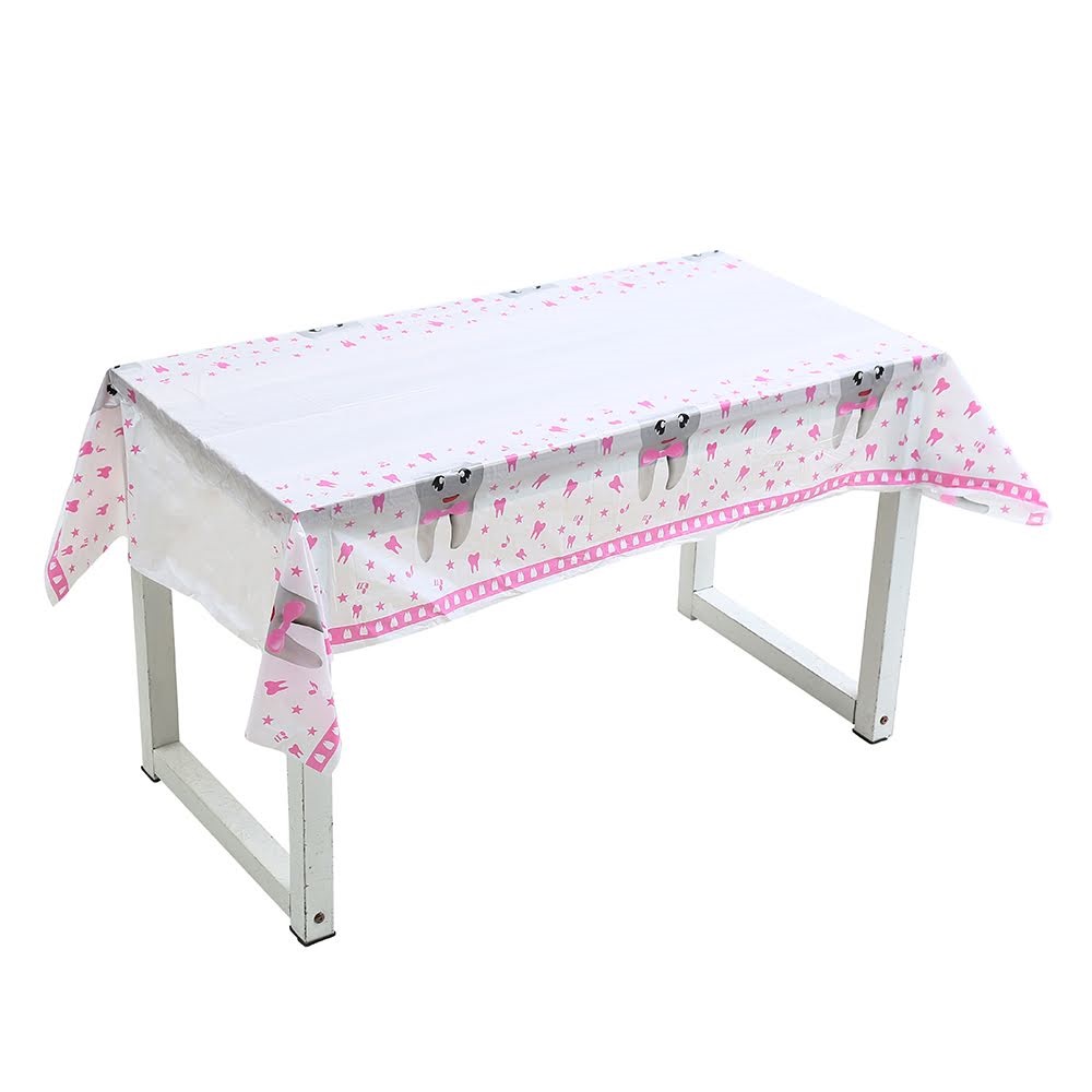 מפת שולחן חד פעמית של המותג שן ראשונה בצבע ורוד לבת.