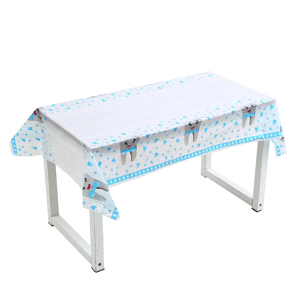 מפת שולחן חד פעמית של המותג שן ראשונה בצבע כחול לבן.