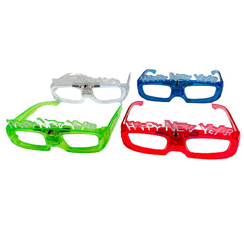משקפי אורות עם הכיתוב HAPPY NEW YEAR בצבעים: כחול, לבן, אדום וירוק.