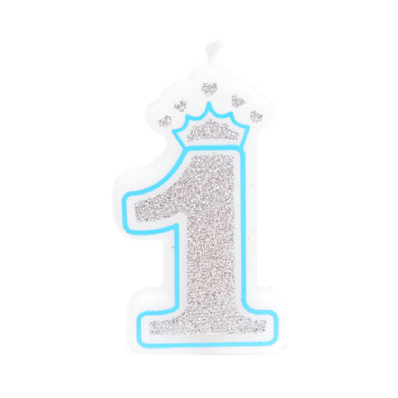נר יום הולדת עם כתר של המספר 1 בצבע תכלת וכסף.