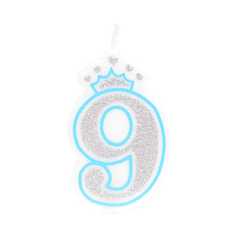נר יום הולדת עם כתר של המספר 9 בצבע תכלת וכסף.