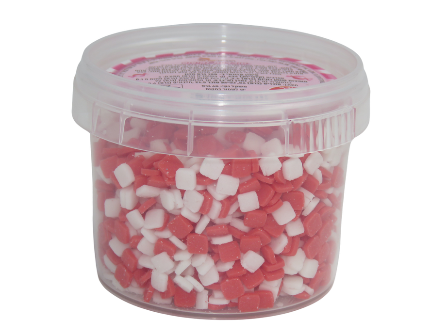 סוכריות בצורת ריבועים בצבעים אדום ולבן לקישוט עוגות ושאר דברי מאפה.