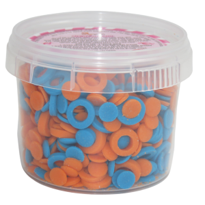 סוכריות בצורת טבעות בצבעים כחול וכתום לקישוט עוגות ושאר דברי מאפה.