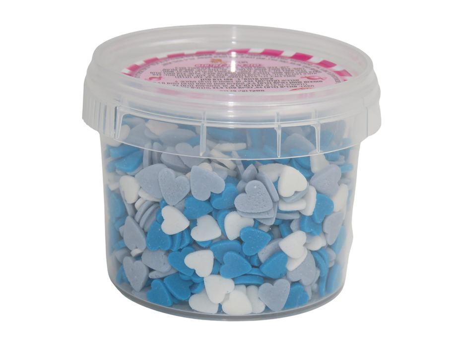 סוכריות בצורת לבבות בצבעים כחול, אפור ולבן לקישוט עוגות ושאר דברי מאפה.