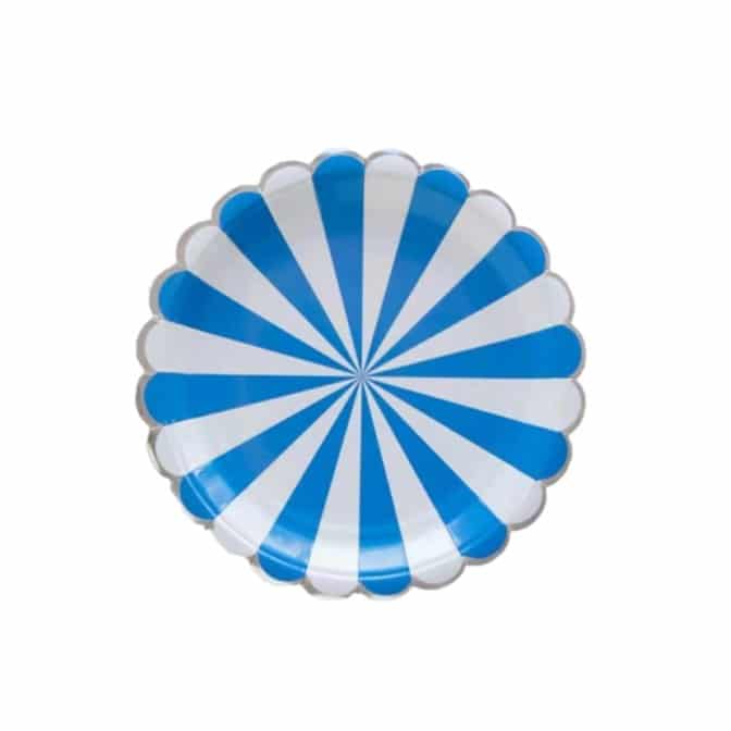 צלחות נייר גדולות פסים בצבעים כחול ולבן.