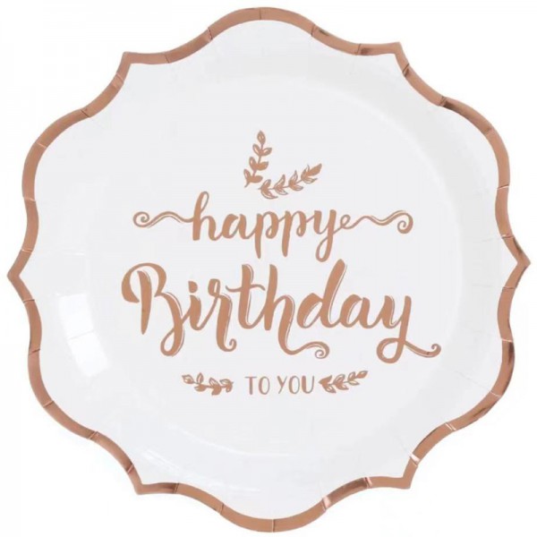 צלחות נייר מתכלה גדולות עם הכיתוב Happy Birthday To You בצבע רוז גולד.