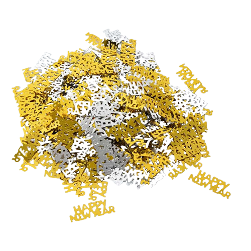 קונפטי לקישוט של הכיתוב HAPPY NEW YEAR בצבעים כסף וזהב.