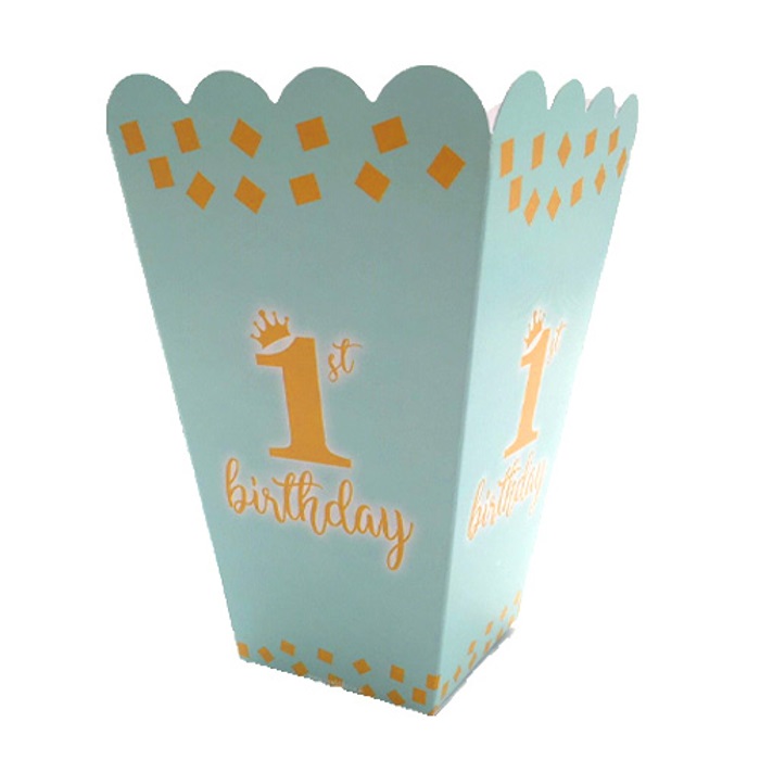קופסאות פופקורן וחטיפים לגיל שנה בצבע כחול לבן.