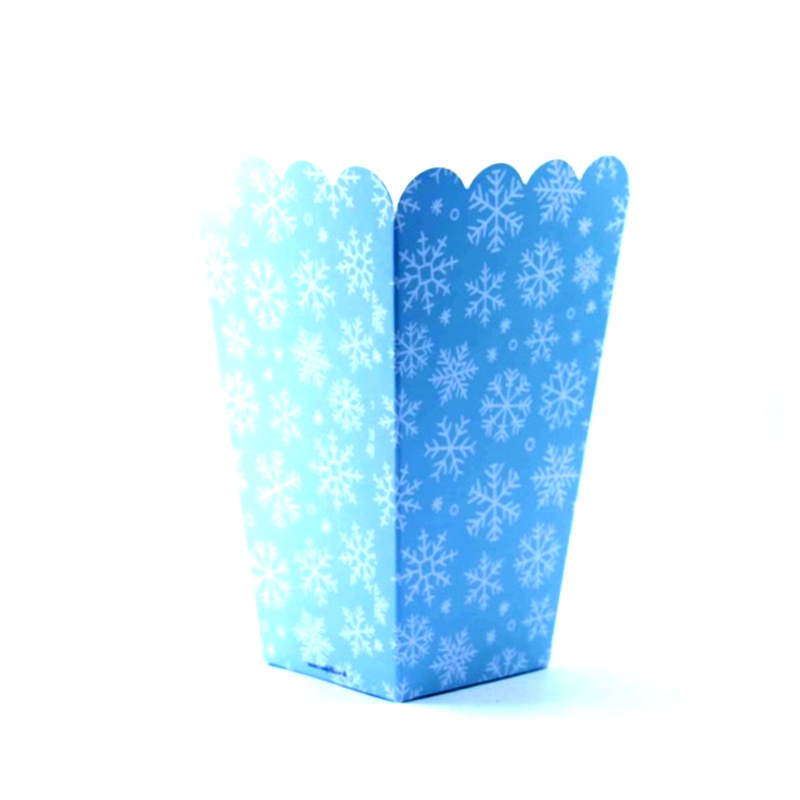 קופסאות פופקורן וחטיפים בעיצוב פתיתי שלג לכריסמס.
