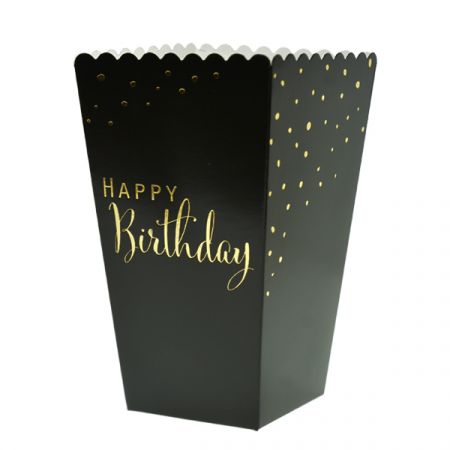 קופסאות פופקורן וחטיפים עם הכיתוב Happy Birthday בצבעים שחור וזהב.