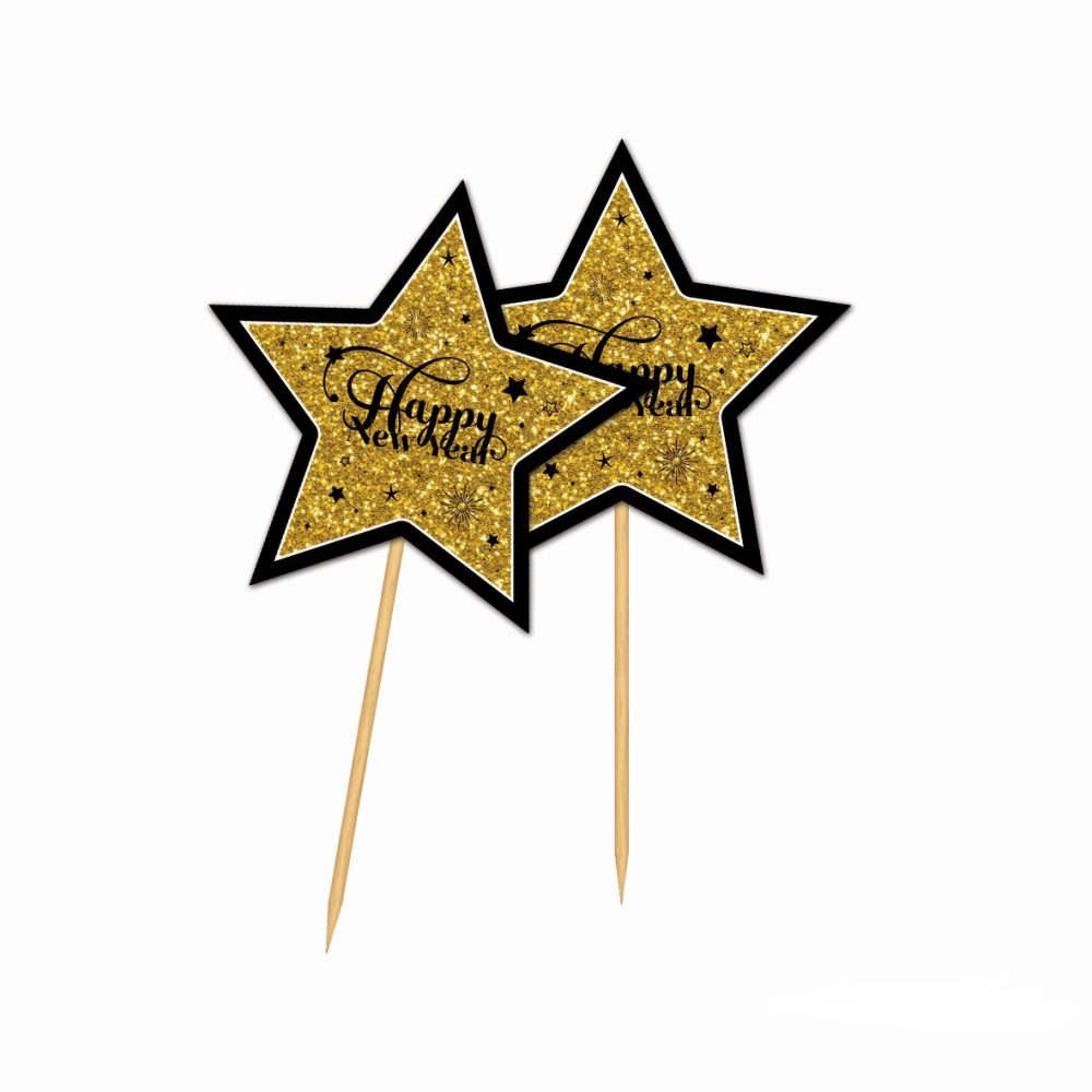 קיסמים בצורת כוכב בצבעים שחור וזהב עם הכיתוב Happy New Year.