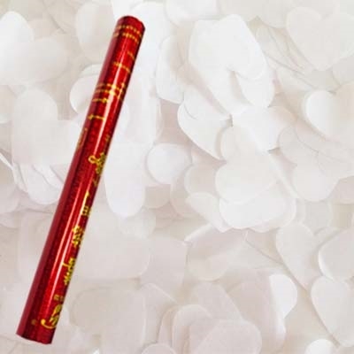 תותח קונפטי בצורת לבבות בצבע לבן.