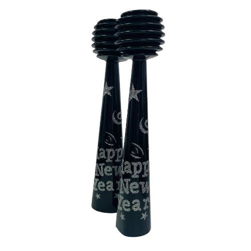 2 חצוצרות שחורות לחיצות עם הכיתוב HAPPY NEW YEAR בצבע כסף.